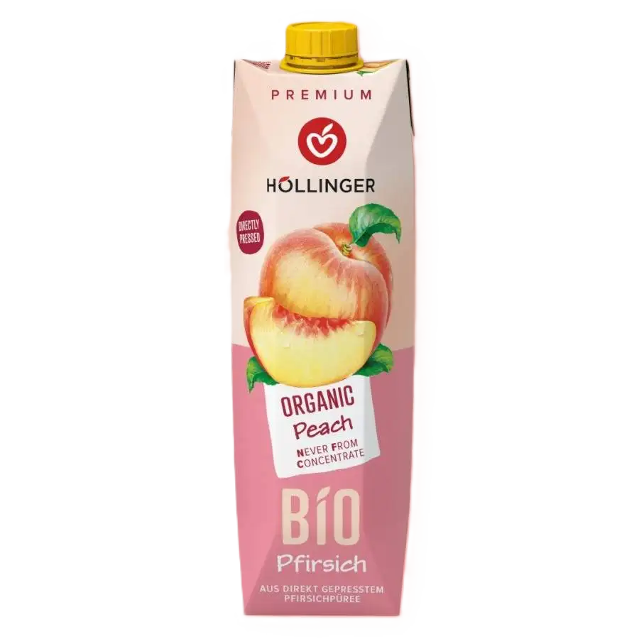 Hollinger Organic Peach Nectar. Noble, ripe organic peaches are processed directly into peach puree. 50% directly pressed, pure peach puree form the basis for this particularly fruity, full-bodied juice and gives it robust body and substance. For the perfect balance of the sugar-acid ratio, natural malic acid was chosen instead of citric acid: it gives the organic peach nectar a special taste nuance and completes its aromatic fruitiness particularly harmoniously.